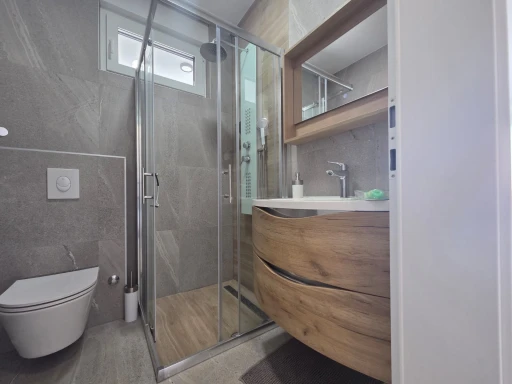 On the ground floor, there is a spacious and bright living area connected to a fully equipped modern kitchen, featuring all necessary appliances for a carefree stay. This level also includes a bathroom with a walk-in shower and toilet.