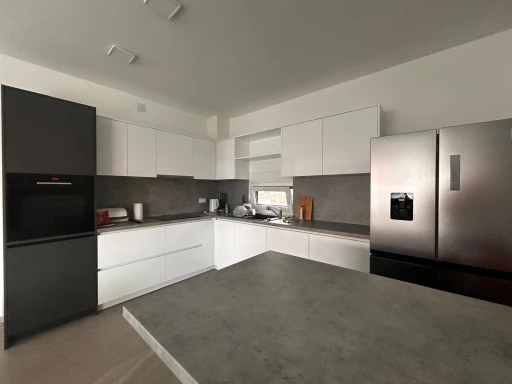 The first floor offers three elegant, air-conditioned double bedrooms, each furnished with a king-size bed and equipped with satellite TV for additional comfort. Every bedroom has its own modern en-suite bathroom with a walk-in shower, while one of the bathrooms also includes a washing machine. All rooms have access to private balconies with a partial sea view, perfect for enjoying your morning coffee or relaxing in the evening.